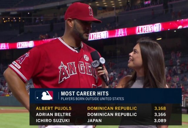 El pelotero dominicano de los Angelinos de los Ángeles, Albert Pujols, despachó dos hits el pasado miércoles 14 de agosto de 2019 en el encuentro contra los Piratas de Pittsburgh, para así superar la marca histórica de 3.166 que estaba en posesión de su compatriota Adrián Beltré.