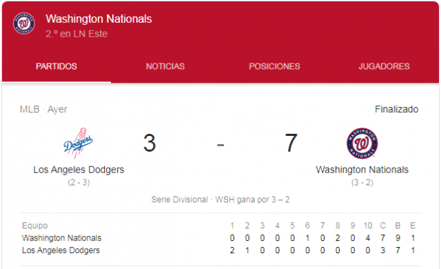 Los Nats van a la Serie de Campeonato de la Liga Nacional por primera vez desde que la franquicia se mudó a Washington desde Montreal antes de la temporada 2005. Lo hacen derrotando a los Dodgers con 106 victorias en la temporada regular, un equipo que, según especialistas, es uno de los mejores de todos los tiempos, en la NLDS. Los Nats se convirtien en el cuarto equipo en la historia de las Grandes Ligas en ganar el pase a la final en extrainnings. Después de quedarse cortos en esta ronda cuatro veces, perdiendo en tres juegos 5 (2012, ’16 y ’17), finalmente dejaron a otro equipo para responder preguntas sobre una salida decepcionante.