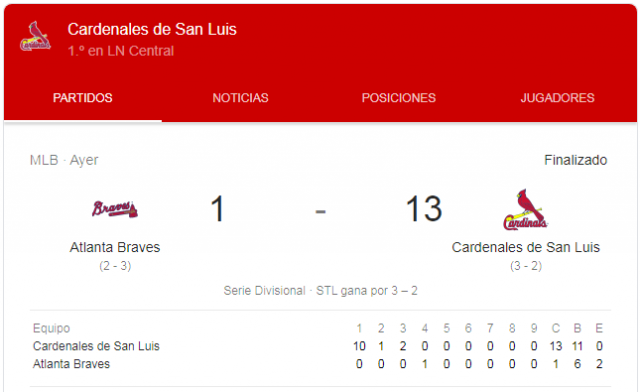 Temprano, al final de la tarde, 5:30pm, en el estadio SunTrust Park, sede de los Bravos de Atlanta, comenzaba el 5to. y último partido de la Serie de División donde los Cardenales de San Luis dieron, en el propio primer inning, un giro inesperado para propios y extraños, lograron una hazaña, récord en postemporada para la MLB, de anotar Diez veces en el primer inning, y así darle un sello definitorio a la serie e ir construyendo el camino de los 27 outs para derrotar a los Bravos y avanzar a la final.