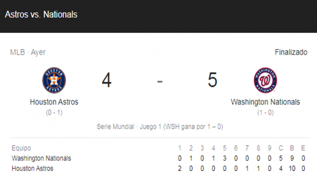 Pero queda mucha pelota que lanzar y batear, así que preparémonos para el resto de esta Serie Mundial inédita para ambos equipos que se enfrentan por primera vez en estas instancias, y es la oportunidad de oro para ambos, Houston de revalidar su título del 2017 y consolidarse como el mejor equipo en los últimos 5 años, mientras que los Nacionales a buscar su primer título Mundial.