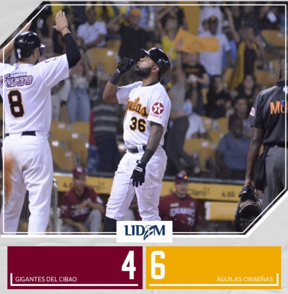 Las Águilas Cibaeñas vencieron a los Gigantes del Cibao, en “El Valle de la Muerte“ del Estadio de Cibao, con score de 6 x 4. Luis Valenzuela conectó cuadrangular de 3 carreras en la parte baja del octavo inning para revertir el marcador, 3 x 4, y poner el score final 6 x 4 a favor de su club, Águilas Cibaeñas.