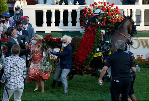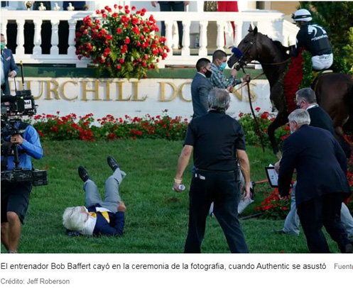 Al momento de la tradicional foto alrededor del caballo, Authentic se asustó cuando le pusieron la guirnalda de 554 rosas rojas para los ganadores de esta carrera y, con demasiada gente alrededor, el movimiento terminó con algunos allegados por el piso. Baffert fue uno de ellos, piernas para arriba, y fue ayudado a reincorporarse mientras Velázquez serenaba al caballo. Incluso tras la carrera, el Kentucky Derby seguía dando patadas.