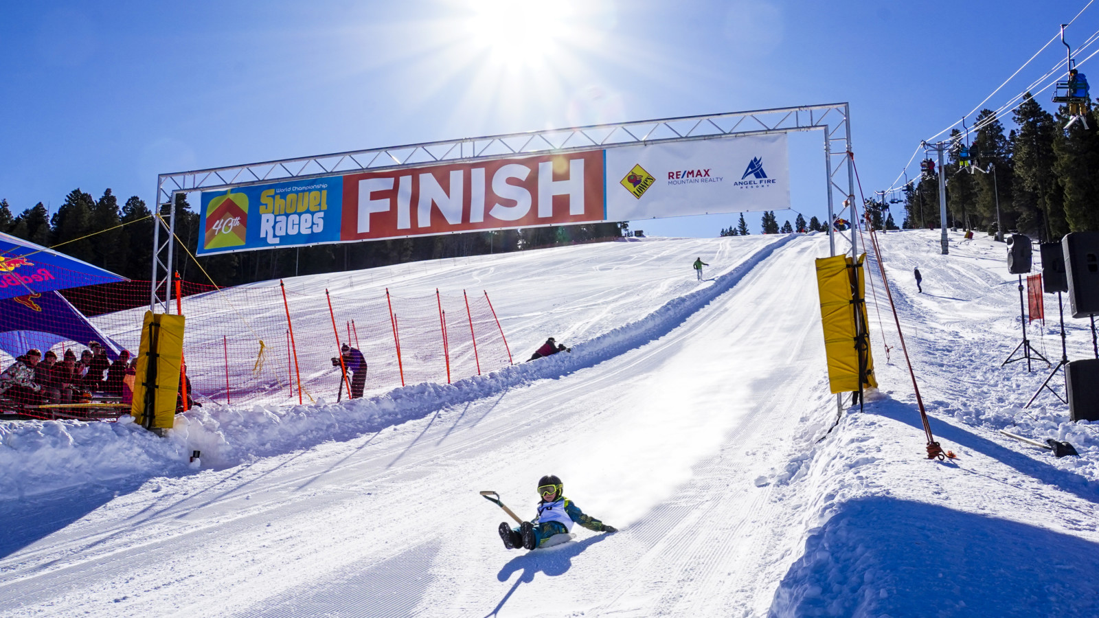 Sin embargo, en 1997, un competidor tuvo un grave accidente a casi 120km/h, y la organización decidió eliminar la prueba de palas modificadas. Así que en el Angel Fire solo se puede correr con una pala corriente, de las que se venden en las tiendas de construcción, aunque se permite usar algún tipo de cera.