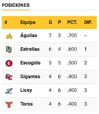 guilas, que terminaron la segunda semana del torneo en la cima con marca de 7-3. Los orientales en cambio subieron su registro a 6-4 y ocupan la segunda posición.