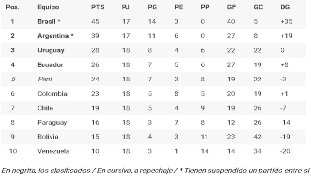 Tabla de posiciones de las eliminatorias sudamericanas, los cuatro primeros van directo, el 5to, lugar a repechaje: