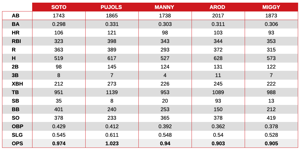 Comparación con Albert Pujols, Alex Rodríguez, Manny Ramírez y Miguel Cabrera