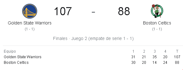 El segundo partido de la Final de la NBA celebrado en la noche de este domingo en el Chase Center de San Francisco, fue uno de esos donde el resultado no refleja lo ocurrido en cancha, es decir, no hubo superioridad alguna, ocurrió todo lo contrario, los Celtics cometieron más errores y Golden State supo capitalizarlos.