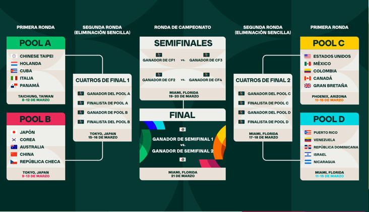 Arrancará el 8 de marzo con el Grupo A, que jugará en Taiwán, y un día después iniciarán los duelos en Japón. Los Grupos C y D, que tendrán como sedes Arizona y Florida, saltarán al diamante el 11 de marzo.
