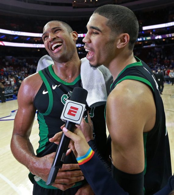 Horford y el novato Jayson Tatum tras la victoria en el tercer partido de la serie.