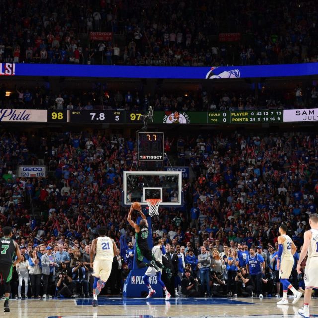 Horford anotando el canasto ganador en el overtime del tercer juego de la serie semifinal de la conferencia este en contra de Philadelphia.